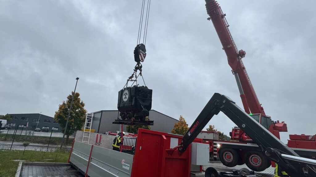 Am 30.09.2025 haben wir mit den ersten Vorbereitungen am neuen Standort begonnen. Es gab einiges zu tun, damit der Förderwagen dort sicher stehen kann. Am 04.10.2025 war dann der große Tag. Im Rahmen eines Übungsdienst hat die Feuerwehr Bochum den Förderwagen am alten Standort verladen und nach Gerthe Am Hellweg transportiert.